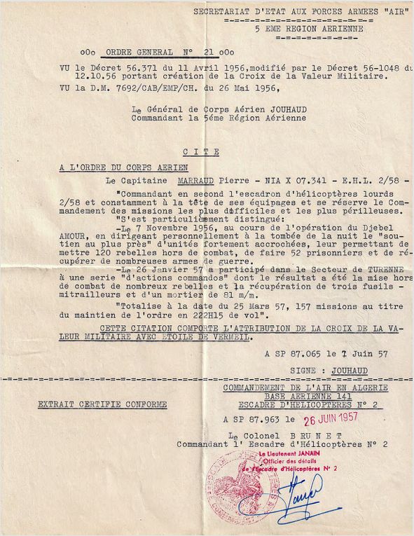 Citation AA Palme 1957, 1958. CA Etoile de vermeil 1958.