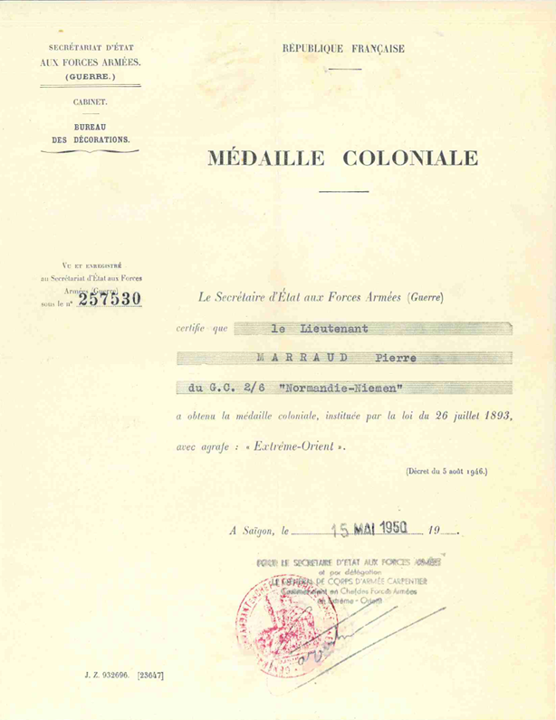 Indochine 01/08/1953, Algérie 15/03/1957. |