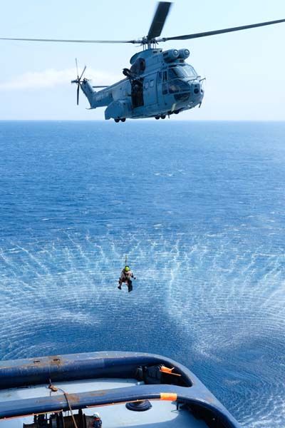 La patiente est conditionnée sur la civière et treuillée à bord du Puma en moins de 30 mn