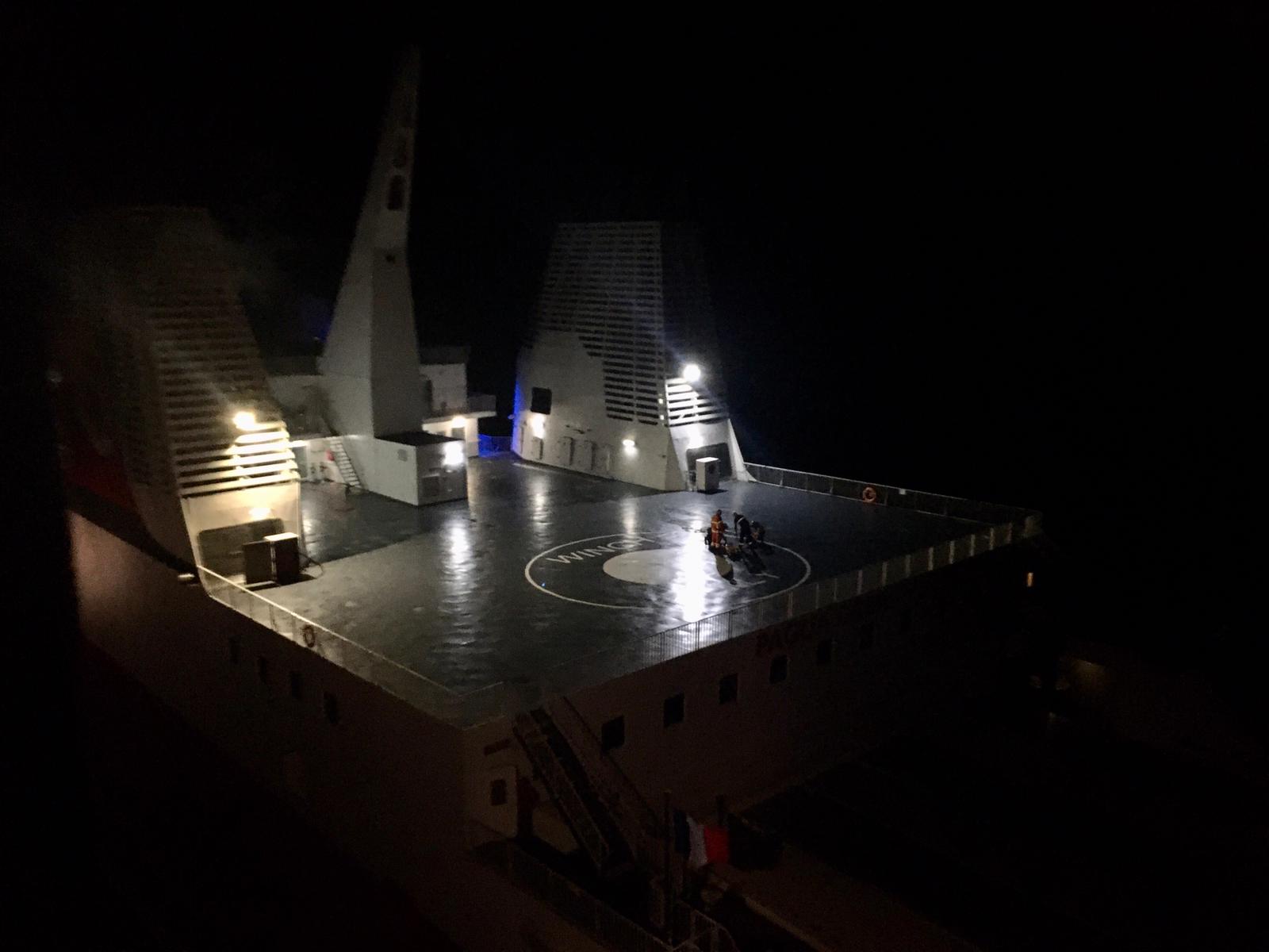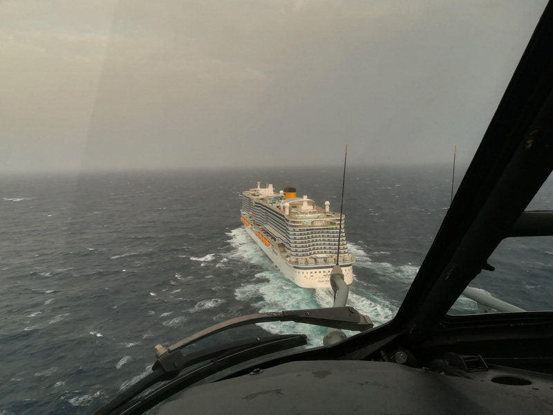 et l’équipage quitte le navire vers l’hôpital d’Ajaccio. Au retour le vent joue contre eux et malgré le rapprochement des côtes induit par la trajectoire du navire, il faudra encore 40 minutes de vol pour enfin rejoindre l’hélisurface de l’hôpital. |