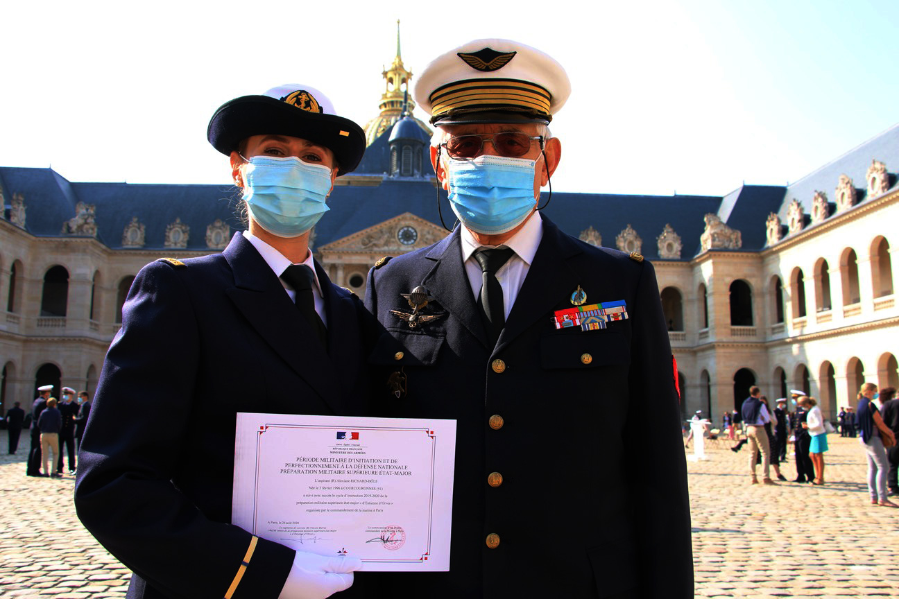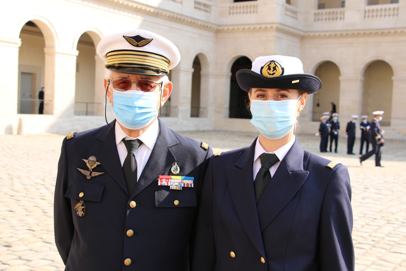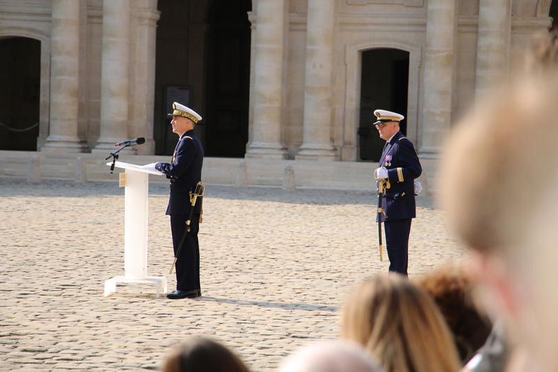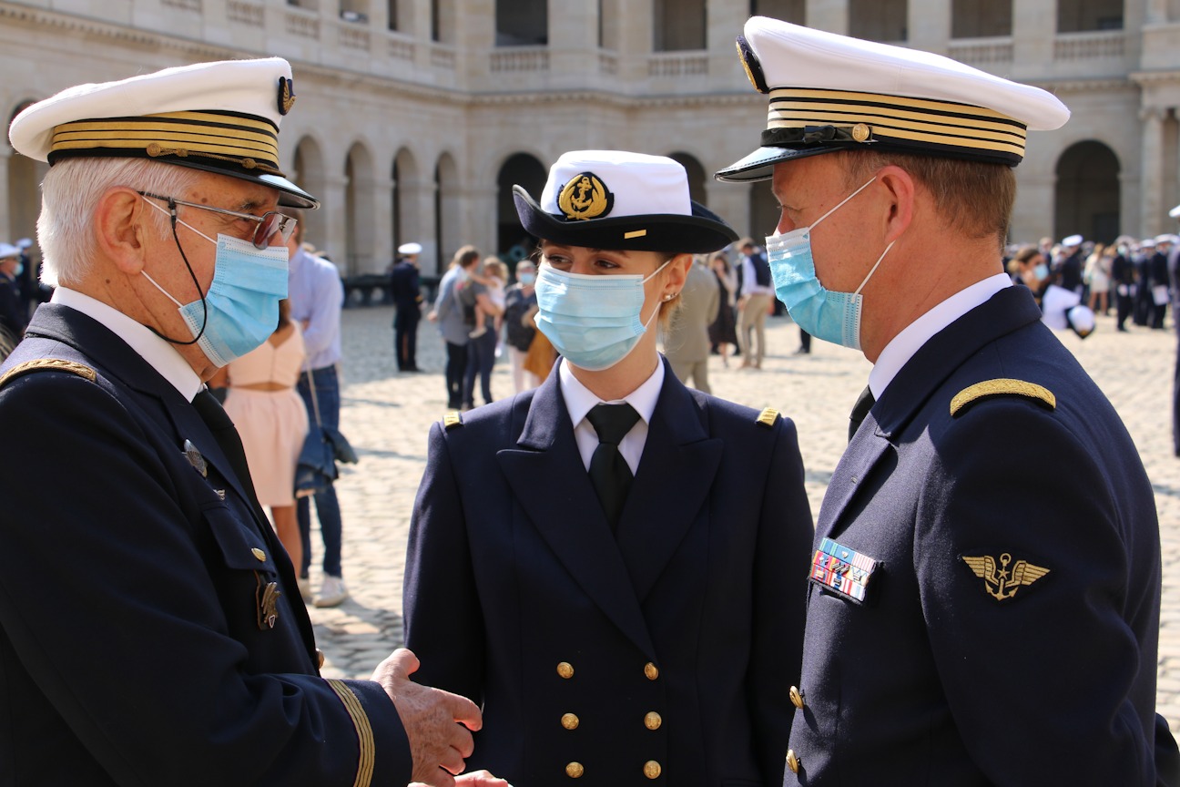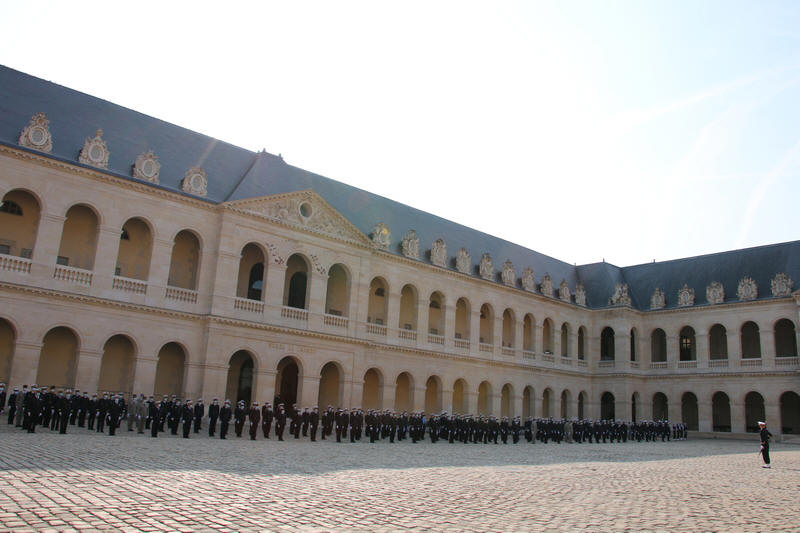 Samedi 12 Septembre, cour d’Honneur des invalides, remise des diplômes de Préparation Militaire Supérieure Marine, option « ÉTAT-MAJOR ». Ma petite nièce m’a demandé d’être son « parrain ». Les parrains appartiennent en très grande majorité à la marine et les grades s’étagent du Vice-amiral d’Escadre à Caporal-Chef. On y trouve même un commandant des Douanes. 10 heures, mise en place (heureusement à l’ombre) des 8 sections, 4 de filleuls et 4 de parrains aux ordres du parrain le plus gradé. La places du parrain, déterminée par l’ordre protocolaire, définit la place du filleul. Je suis le dernier du premier rang de la 4ème section. Moment émouvant car je représente mon frère Bernard cloué au lit depuis près de 2 années. Une répétition permet à chacun de connaître la manœuvre à réaliser et au filleul de remettre le diplôme au parrain. Puis, c’est, comme dans toute cérémonie militaire, l’attente.