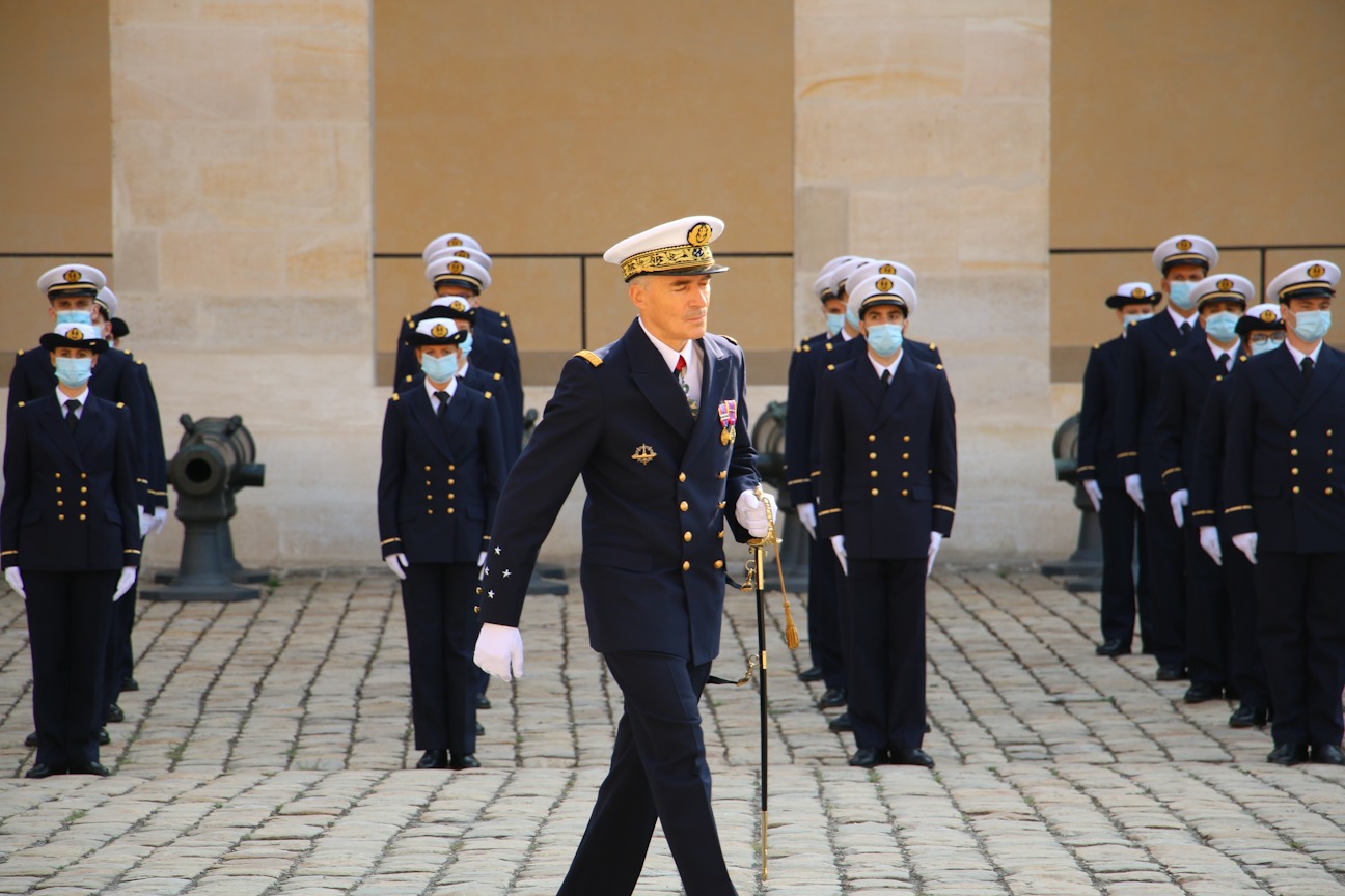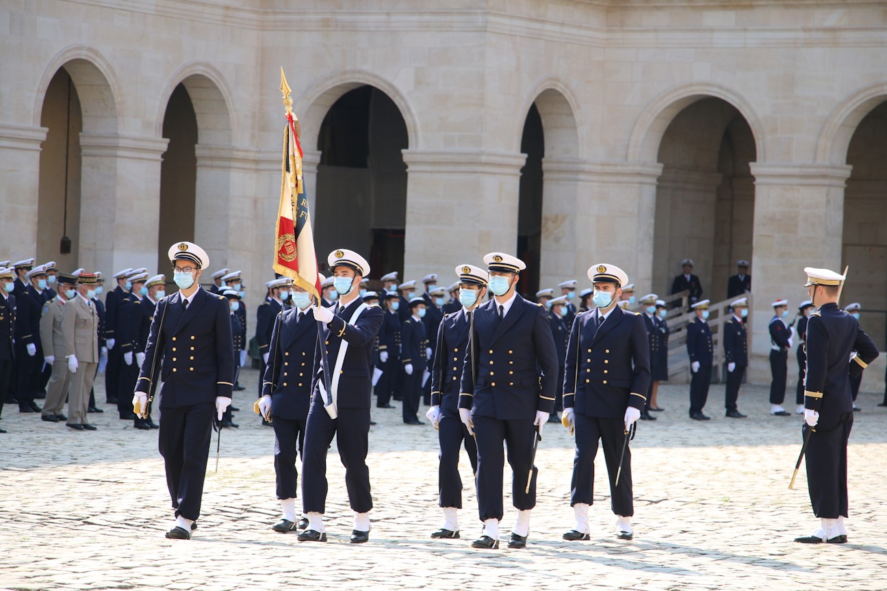 Puis le VAE prononce une allocution centrée sur trois mots qui représentent les qualités d’un marin : Pugnacité, Engagement et Sacrifice en prenant en exergue Honoré d’Estienne D’Orves, parrain du centre de formation et ce drapeau, le troisième plus décoré de France.